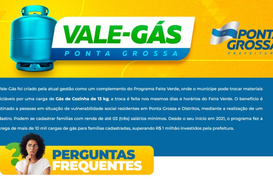 Com o início do programa Feira Verde, a Prefeitura de Ponta Grossa começa na próxima segunda-feira (02/02) o cadastro dos moradores que podem participar do ‘Vale Gás’ – iniciativa que segue a mesma dinâmica do Feira Verde, destinada para famílias que possuem renda de até três salários mínimos. Neste ano, o cadastro será 100% on-line: basta acessar o site https://smapa.pontagrossa.pr.gov.br/valegas/e seguir o passo a passo.